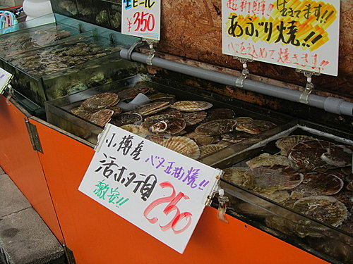 小樽必吃: 扇貝= 烤扇貝200600日圓之間, 是大小而定. 除了扇貝還有螺類等等, 真的新鮮又好吃.