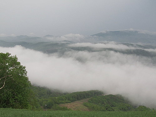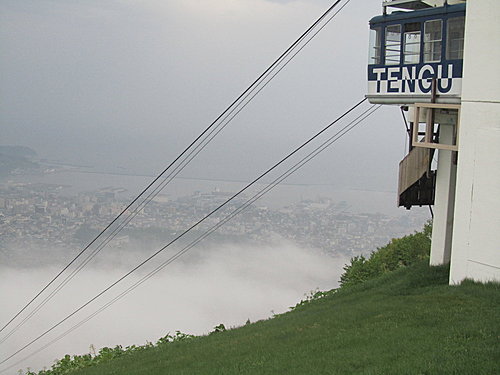 坐上纜車上山囉. 上山後, 很不巧地遇上大雷雨. 所以看不到什麼景, 但有雲霧飄渺, 也很棒. 逛了十幾分鐘,突然有穿制服的工作人員跑過來, 表示纜車因為大雨所以停駛, 他們開了一部休旅車來載遊客下山. 下山後, 直接送我們到巴士站, 服務有夠好呢.